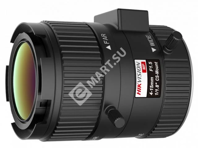 Hikvision HV0415D-MP - вариофокальный 3Мп объектив 1/1.8"; Фокусное расстояние 4-15мм F1.5-С. Крепление CS; мин. рабочее расстояние 0.1м; АРД DC. Угол обзора гор. 101.9°31.3°. Размер Ф50.2х73.8мм. Рабочие условия -20 °C ~ 60 °C. Вес 102гр.