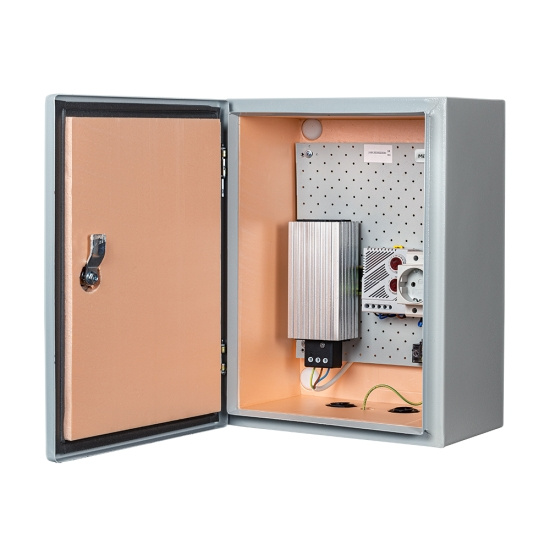 утеплитель из пенополистирола, замок 1 шт,ключ 1 шт, монтажная плата 1шт, гермовводы 2шт, розетка 1 шт, автоматический выключатель 1шт, гигростат NT 78-M (электронный) 1шт,нагреватель мощностью в 75 Вт 1шт.