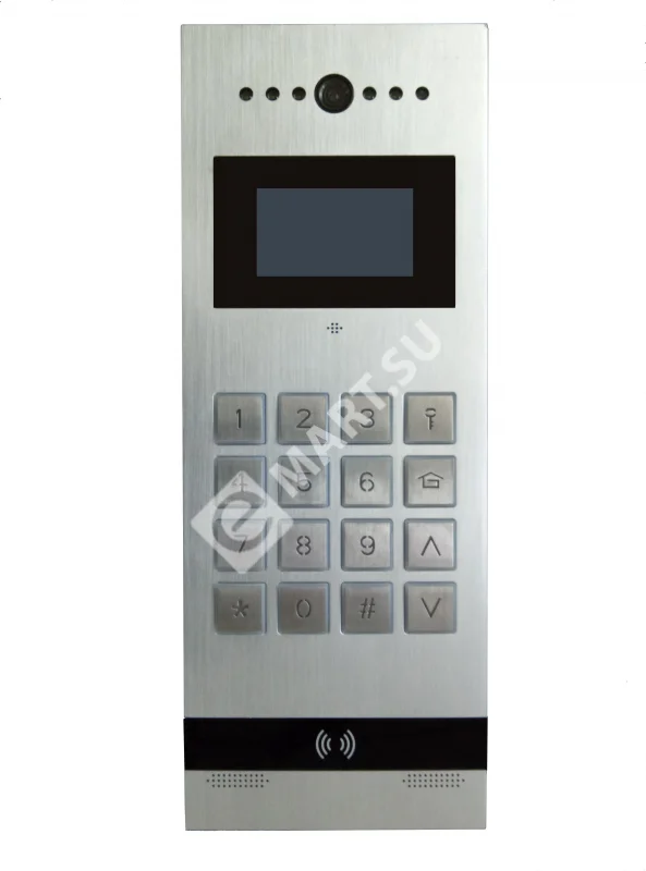 Вызывная панель цветного многоквартирного домофона со встроенным считывателем карт Em-marin. Прочный алюминиевый корпус. Анимированный TFT дисплей. Простое подключение с помощью разъемов RJ-45 (подключение по стандарту T568B). Управление замком. Подключение датчика положения двери. Выход Wiegand-26 для подключения к стороннему контроллеру СКУД.