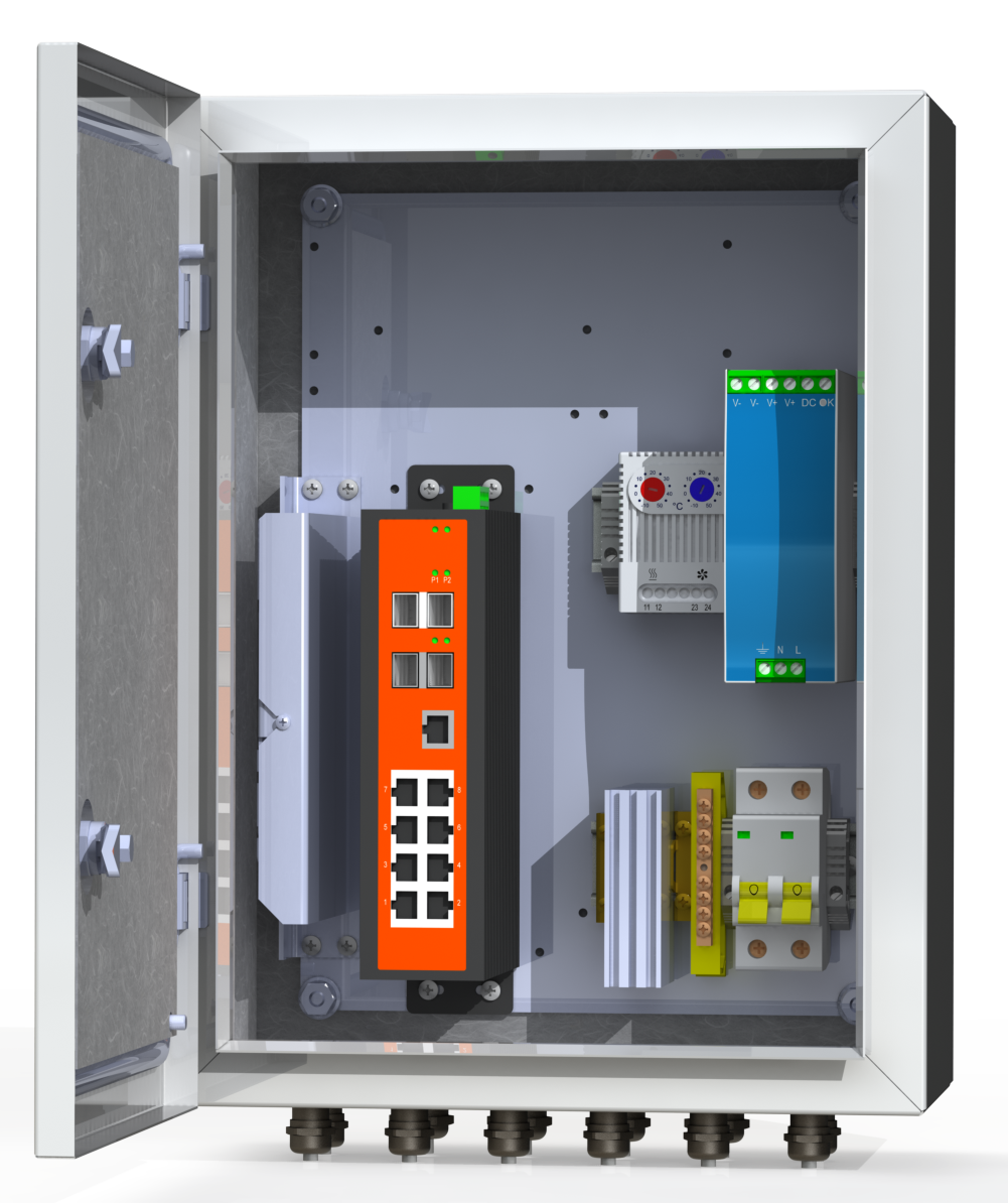 Двухполюсный защитный автомат 6А - 1 шт. Обогреватель 50Вт - 1 шт. Сдвоенный термостат - 1 шт. Блок питания 240Вт -1 шт. Промышленный управляемый коммутатор 8*PoE 802.3 af/at (бюджет 230 Вт), 4*SFP, 1*console port - 1 шт. Оптический кросс 4 порта SC/SM - 1 шт. Гермовводы 8*PG9, 4*PG13,5 -1 комплект.