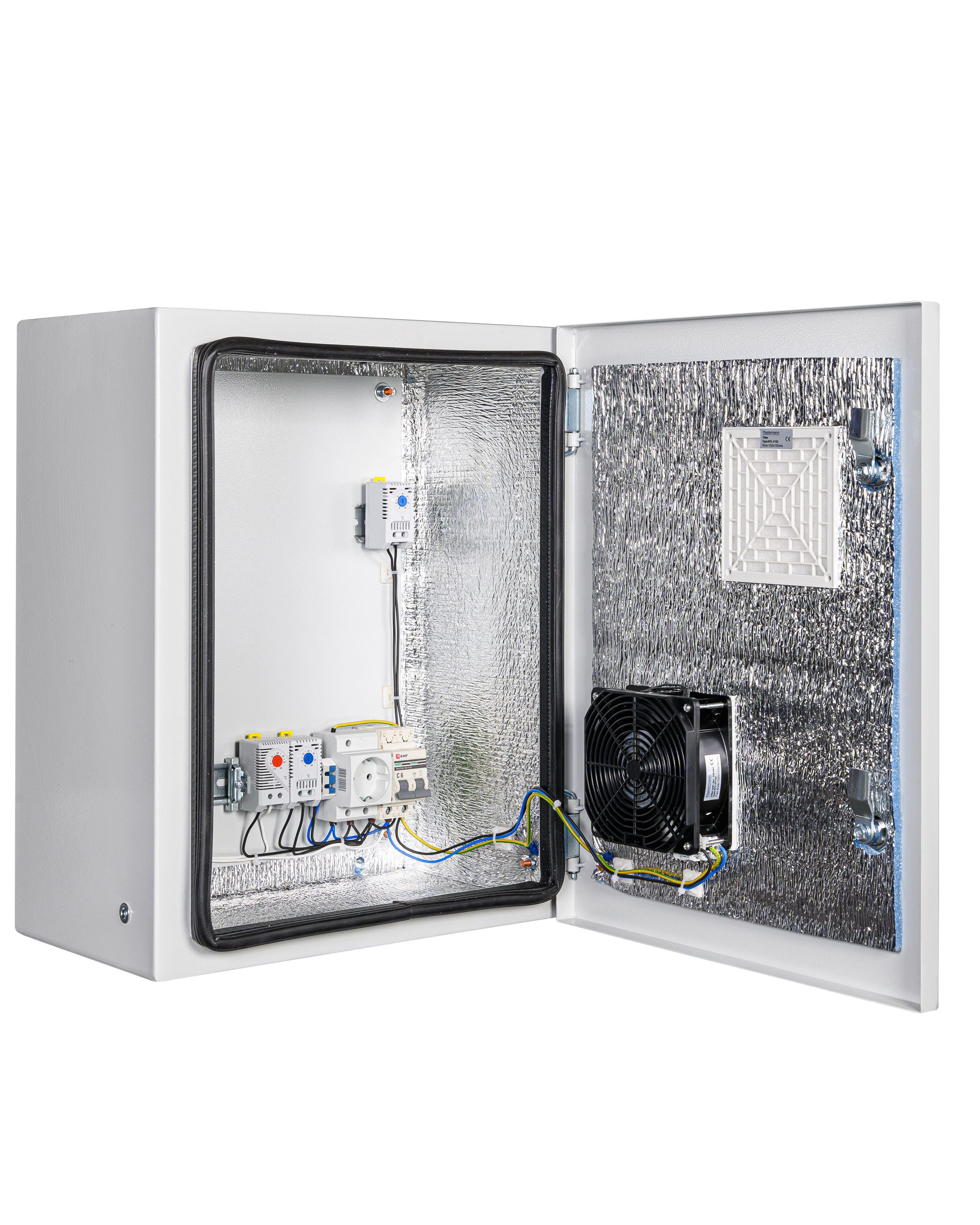 утеплитель из порилекса, замок 2 шт,ключ 1 шт, монтажная плата 1шт, гермовводы 2 шт (MG-25), розетка 1 шт, автоматический выключатель, 6А 1шт, клемма для подключения оборудования 2 шт, клемма заземления 1 шт, термореле 1шт, реле предстарта 1 шт, вентиляционная решётка с фильтром 1 шт, вентилятор с решёткой и фильтром 1 шт, нагреватель мощностью 75 Вт 1шт.
