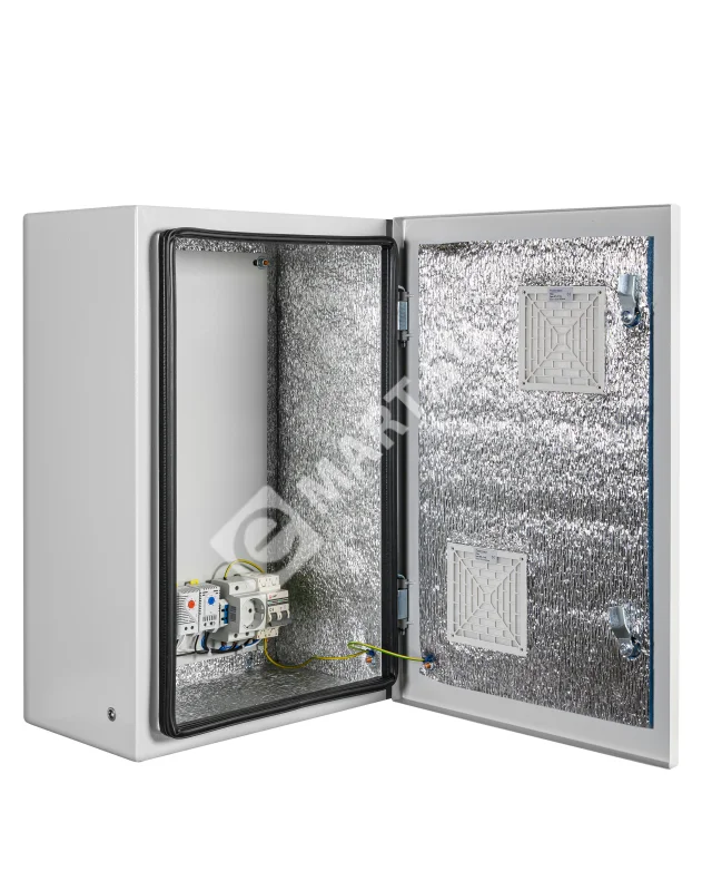 утеплитель из порилекса, замок 2 шт, ключ 1 шт, монтажная плата 1шт, гермовводы 2 шт (MG-25), розетка 1 шт, автоматический выключатель, 6А 1шт, клемма для подключения оборудования 2 шт, клемма заземления 1 шт, термореле 1шт, реле предстарта 1 шт, вентиляционная решётка с фильтром 2 шт, нагреватель мощностью 100 Вт 1шт.