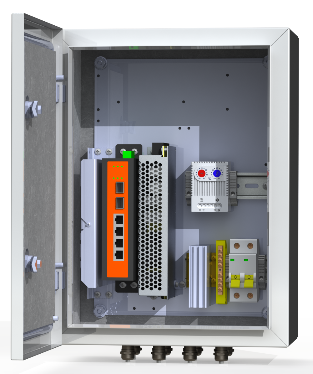 Двухполюсный защитный автомат 6А - 1 шт. Обогреватель 50Вт - 1 шт. Сдвоенный термостат - 1 шт. Блок питания 150Вт -1 шт. Промышленный неуправляемый коммутатор 4*PoE 802.3 af/at (бюджет 140 Вт), 2*SFP - 1 шт. Оптический кросс 4 порта SC/SM - 1 шт. Гермовводы 4*PG9, 4*PG13,5 -1 комплект.