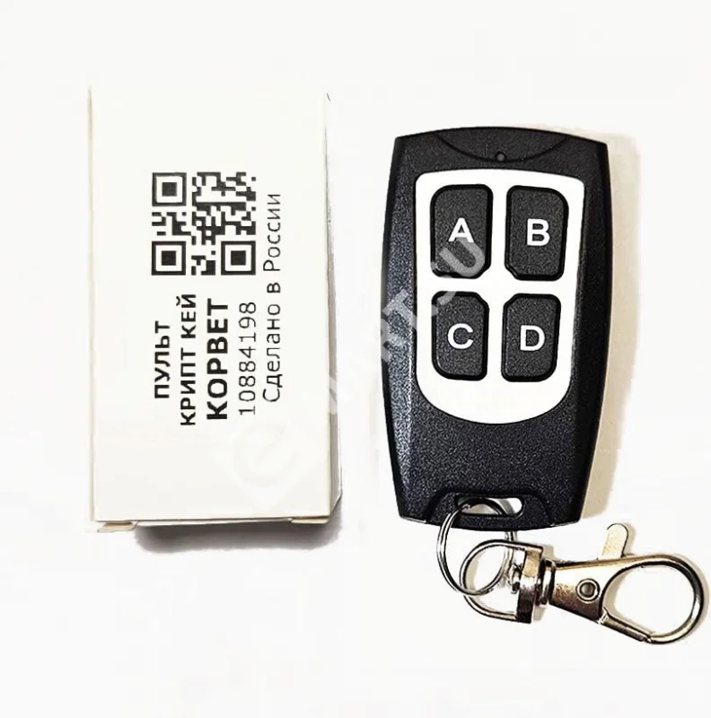 Пульт дистанционного управления с предустановленным ключом шифрования, для работы с моделями ТОСС «Корвет». Пульты «КРИПТ КЕЙ «КОРВЕТ» защищены от копирования/клонирования и записываются в исполнительный блок моделей «Корвет» с помощью клавиш записи на канал реле или через приложения, путем ввода серийный номер пульта или сканирования QR кода на коробке.