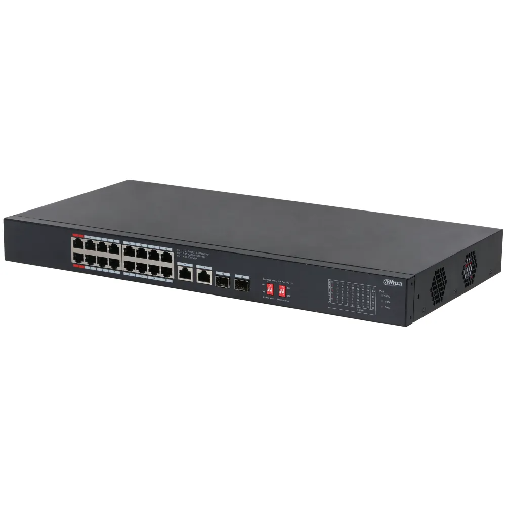 Порты: 16 RJ45 10/100/1000Мбит/с (PoE/PoE+/Hi-PoE), 2 RJ45 10/100/1000Мбит/с (uplink), 2 SFP 1000Мбит/с (uplink); мощность PoE: порты 1~2 до 90Вт, порты 3~16 до 30Вт, суммарно до 240Вт; PoE watchdog; питание: 100~240В(AC)