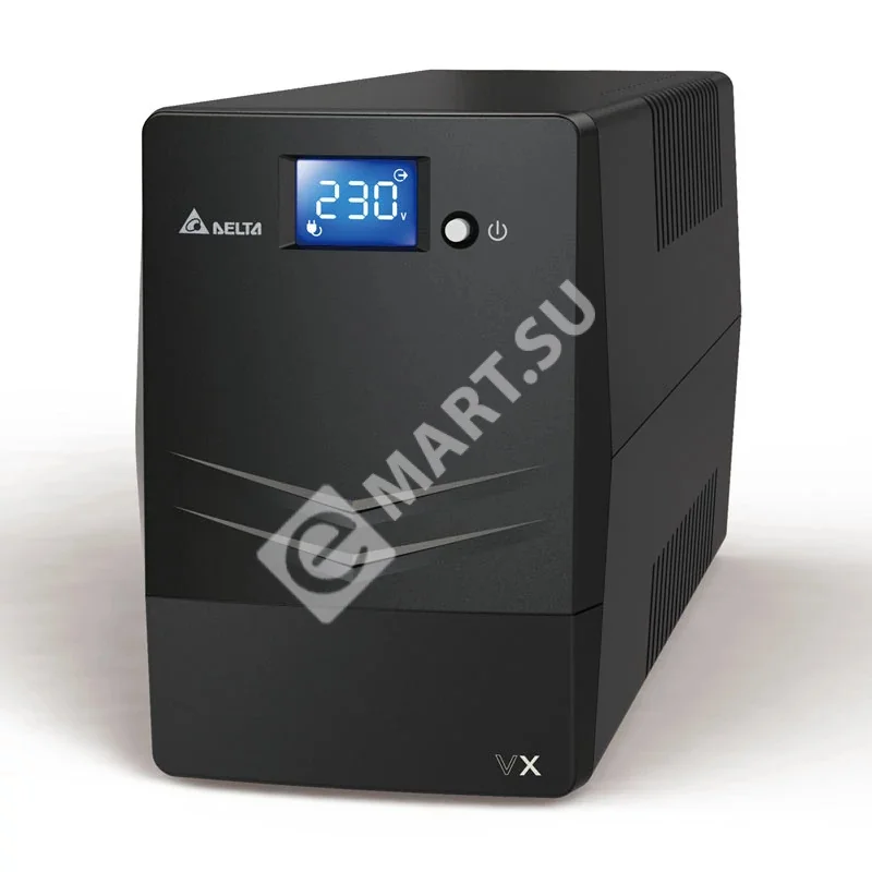 ИБП Delta Electronics VX-600VA, 1ph-1ph, Исполнение Tower, технология line-interactive, 600 ВА/360 Вт, встроенная АКБ (1 элемент 12В/7Ач), 230В 50Гц. Защита по входу: автомат. Разъемы: 4 x IEC C13, Размеры 101 x 300 x 142 (ШхГхВ мм), 4,4 кг