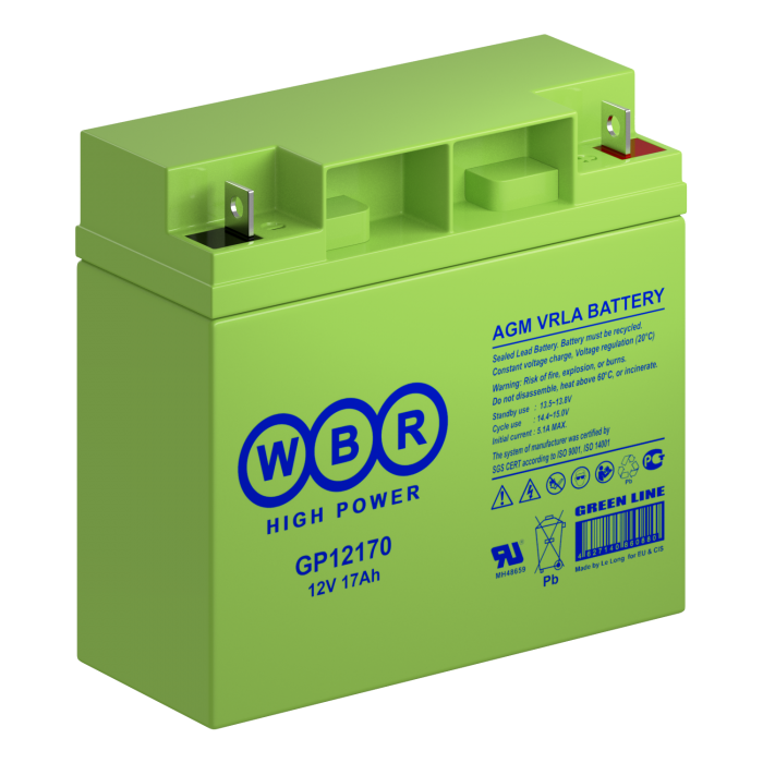 Аккумулятор WBR GP12170 - герметизированная, выполненная по технологии AGM, аккумуляторная батарея общего применения со сроком службы до 8 лет в буферном режиме или 260 циклов заряда-разряда в циклическом режиме при 100% разряде. Эта высокоэффективная, перезаряжаемая батарея, не требующая обслуживания в течение всего срока службы.