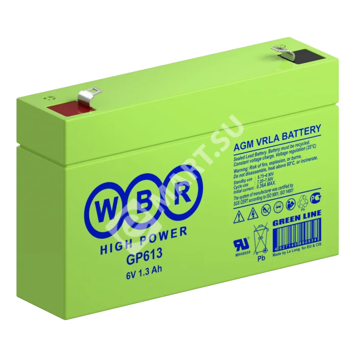 Аккумулятор WBR GP613 - герметизированная, выполненная по технологии AGM, аккумуляторная батарея общего применения со сроком службы до 8 лет в буферном режиме или 260 циклов заряда-разряда в циклическом режиме при 100% разряде. Высокоэффективная перезаряжаемая батарея, не требующая обслуживания в течение всего срока службы.