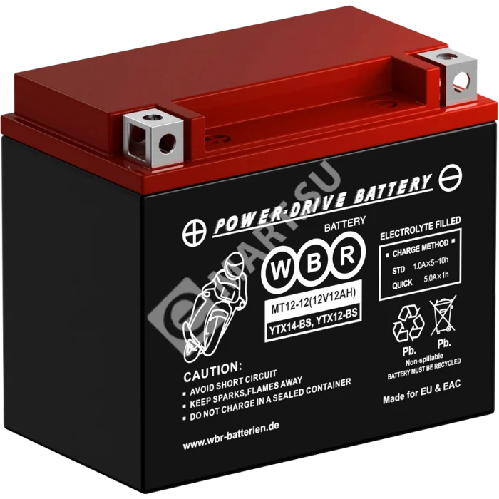 Аккумулятор WBR МТ12-12 - герметизированная, выполненная по технологии AGM, необслуживаемая (MF) стартерная мотоциклетная свинцово-кислотная аккумуляторная батарея. Обладает высоким качеством и надежностью. Она предназначена для запуска двигателя мотоциклов, скутеров, гидроциклов, квадроциклов, снегоходов и мотовездеходов. Батарея соответствует техническим характеристикам и является аналогом мотоциклетных аккумуляторных батарей YUASA моделей YTX14-BS и YTX12-BS.