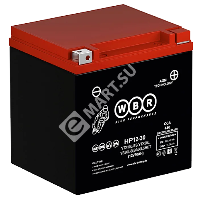 Аккумулятор WBR HP12-30 - герметизированная, выполненная по технологии AGM, стартерная мотоциклетная свинцово-кислотная батарея. Обладает высоким качеством и надежностью. Эта аккумуляторная батарея успешно выдерживает конкуренцию со стартерными батареями этого класса других производителей, соответствует техническим характеристикам и является аналогом мотоциклетных аккумуляторных батарей YUASA Y50-N18L-A, Y50-N18L-A3, YTX24HL-BS. Она предназначена для эксплуатации на мотоциклах, скутерах, гидроциклах, квадроциклах, снегоходах и мотовездеходах.