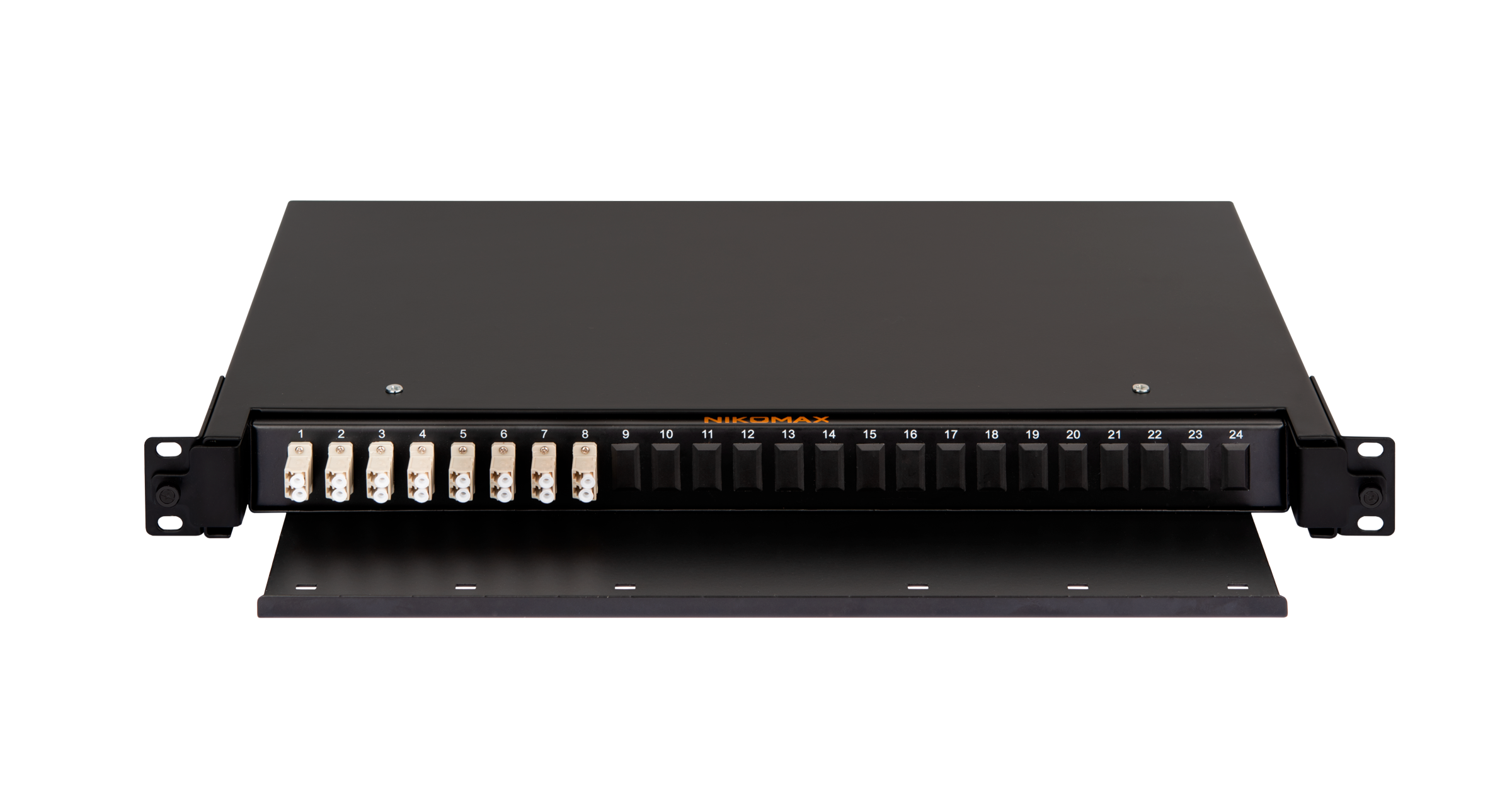 Оптический кросс NIKOMAX 19" Premium Line, 1U, укомплектованный на 16 портов LC/UPC (8 двойных LC/UPC адаптеров), MM 50/125 OM2, выдвижной, с полкой,  черный, в комплекте: адаптеры, монтажные шнуры 1м, сплайс-кассета с крышкой, гильзы, заглушки