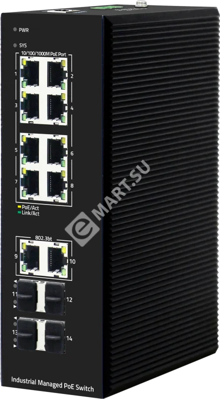 Управляемый промышленный L2 коммутатор NIKOMAX, 8*10/100/1000Мбит/с PoE (af/at), 2*10/100/1000Мбит/с PoE (BT), 2*1Гбит/с SFP, 2*2.5Гбит/с SFP, Крепление на DIN-рейку, 2*ввода питания, питание 12-55В (блок питания 420Вт поставляется отдельно), -40С +85С.