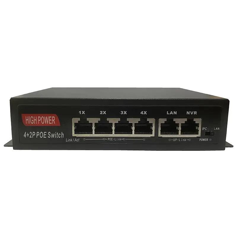 HN-POE204 V2 – неуправляемый коммутатор на 6 портов, 4 из которых с поддержкой технологии POE стандарта 802.3af/at (Type A) 100Мбит. Максимально поддерживаемая мощность подключаемых устройств составляет 30Вт на порт. Дополнительно присутствуют 2 порта с максимальной скоростью до 100Мбит: один для подключения видеорегистратора или другого видеозаписывающего устройства, другой для подключения к сети интернет-провайдера. Данный комутатор может работать в режиме IPC, который позволяет передавать данные без питания по PoE на расстояние до 250 метров на скорости до 10 Мбит/с. Максимальная суммарная нагрузка на POE составляет 85 Вт