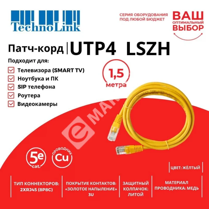 –Technolink Патч-корд UTP4 cat 5e, 1,5м, ВС, LSZH, желтый, литой коннектор