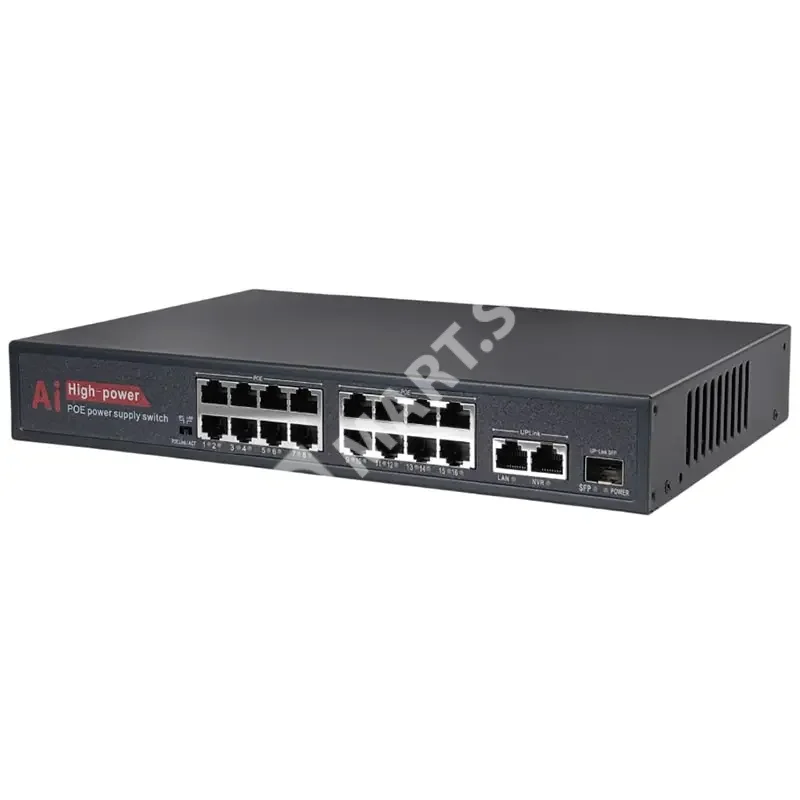 - 16 портов PoE+ с мощностью до 30 Вт каждый: Обеспечивает питание и передачу данных для широкого спектра устройств, включая поворотные камеры, видеодомофоны и профессиональное сетевое оборудование.